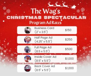 In appreciation of any donation of $150.00 or more, we would like to provide you with (2) tickets to The Wag’s Christmas Spectacular show!